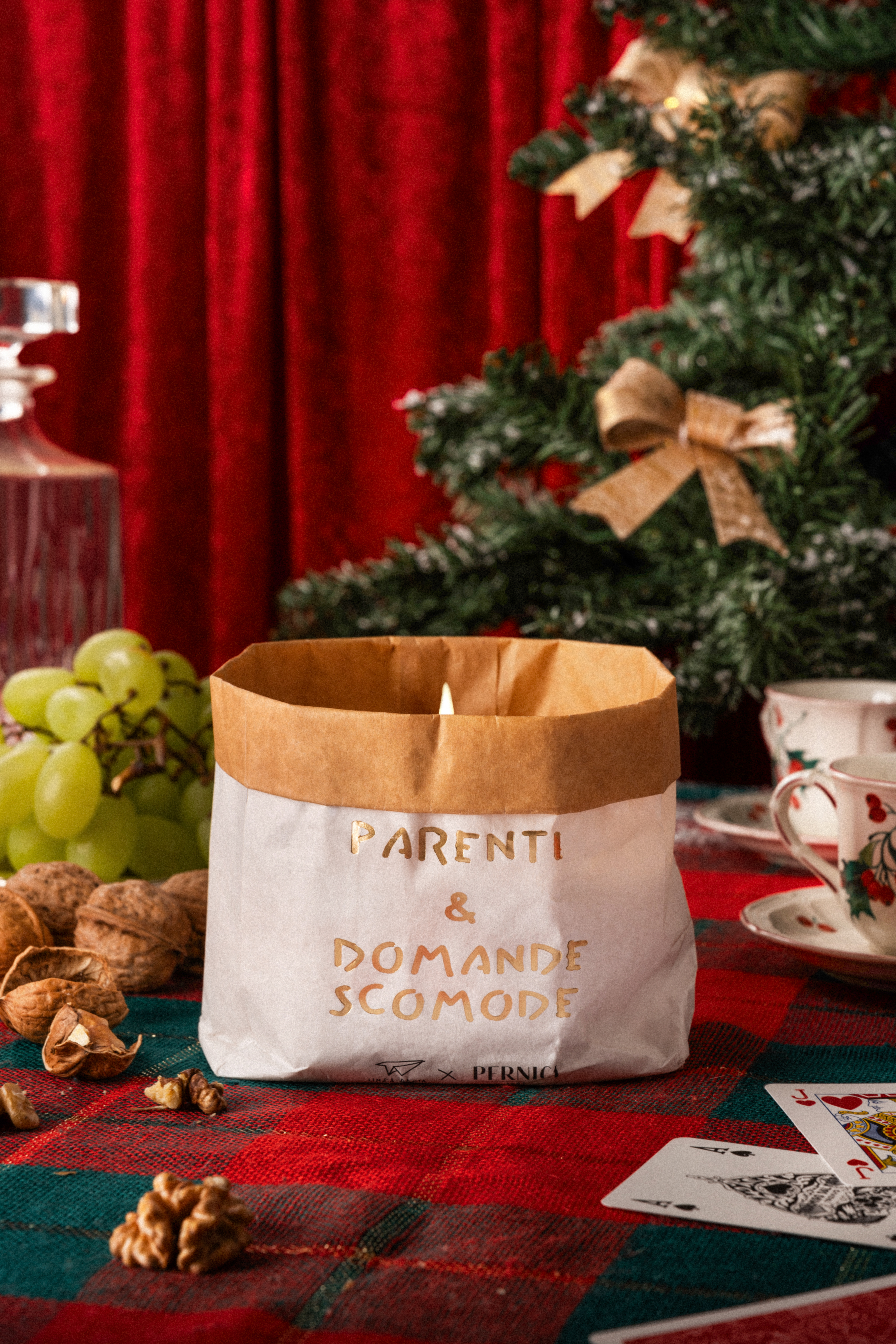 « Parenti & Domande Scomode» est la phrase vedette de l’édition spéciale de Noël Pensieri Stropicciati, née de la collaboration entre Pernici et Linea Daria. Une touche d’humour délicate, inspirée des repas de famille, entre éclats de rire, souvenirs et questions un peu trop directes. Présentée dans un sachet en papier ignifuge orné d’une inscription dorée, cette bougie diffuse le parfum XMAS : un mélange d’agrumes, de lavande et de bois balsamiques qui évoque toute la chaleur des fêtes. La lumière qui traverse le papier crée une atmosphère douce et chaleureuse, comme une lanterne festive. Une idée cadeau originale, pleine d’esprit et de charme, parfaite pour illuminer Noël avec humour et élégance.